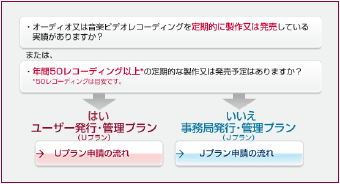 ユーザー発行・管理プラン(Uプラン)と事務局発行・管理プラン(Jプラン) の違いは、Uプランが「年間10,500円の定額料金制」で、Jプランが「一曲315円の個別料金制」という課金方法の違いだけです。どちらを選択しても発行されるISRCは同じですので「こっちの方が有利!」と言うような事はありません。一年間で自分が発表する予定の曲数によって、安く済む方を選択して下さい。